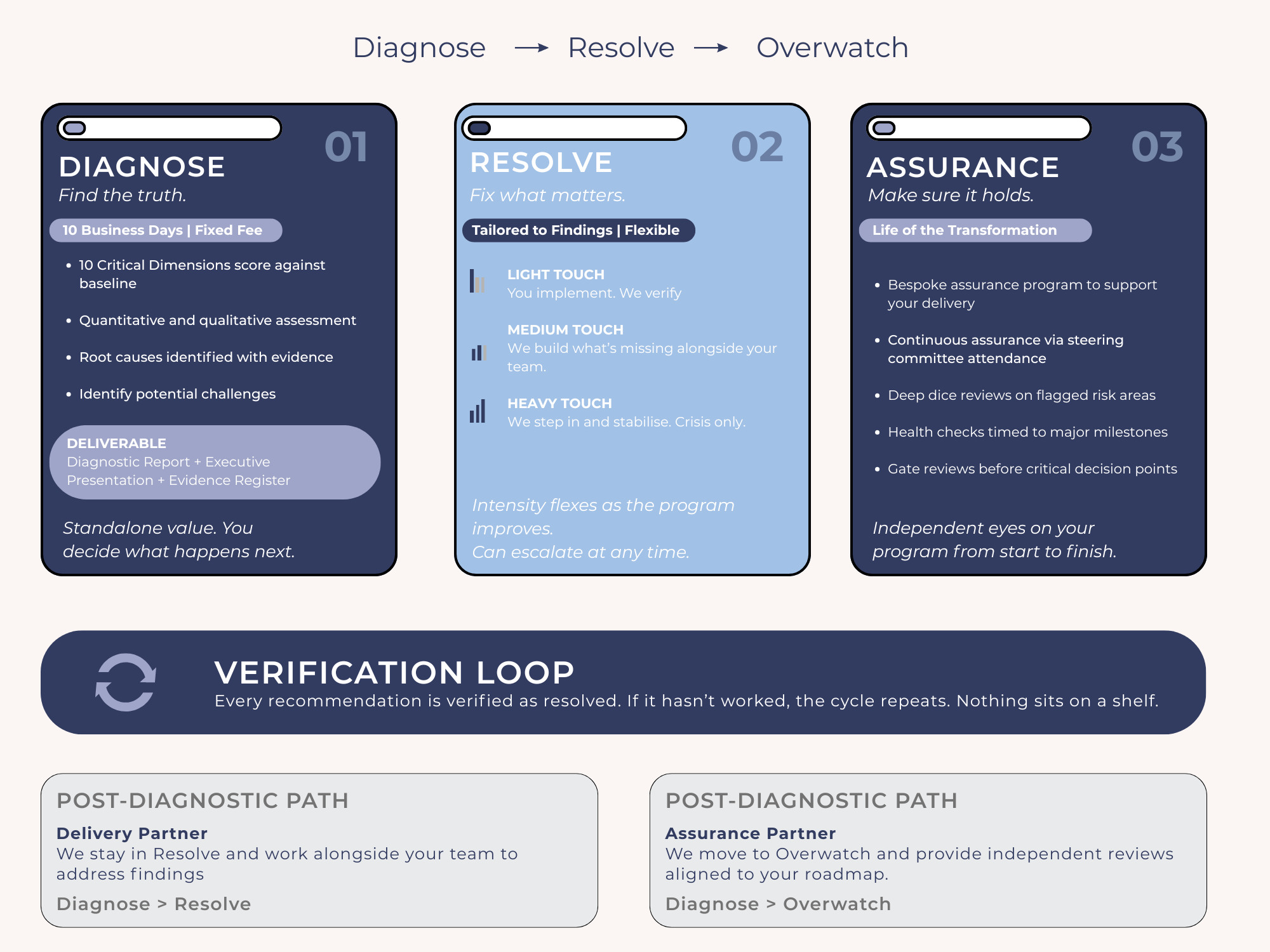 Once your transformation is back on track, we can provide our overwatch service, ensuring it stays that way.