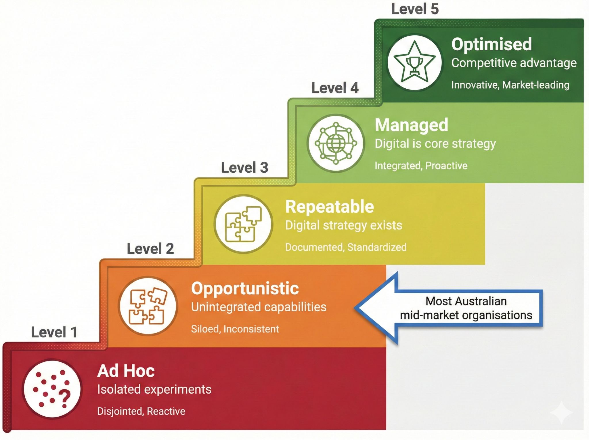 Most Australian mid-market organisations sit at Level 2-3 digital maturity.